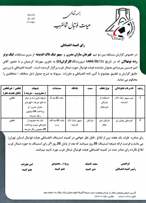 آرای صادره از سوی کمیته محترم انضباطی هیأت فوتبال شمالغرب، در خصوص تیم سپهر تیک تاک اندیشه و آقای امیرعلی روئین تن (بازیکن تیم مذکور)، اتخاذ و جهت اجرا ...