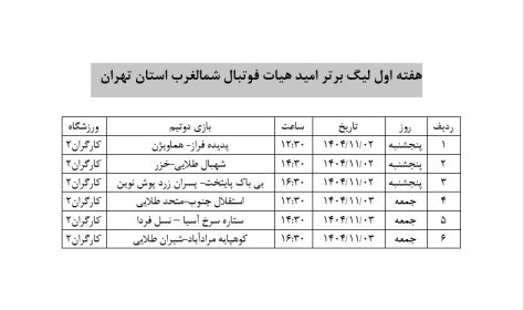 برنامه بازی های لیگ برتر امید هیأت فوتبال شمالغرب هفته اول.